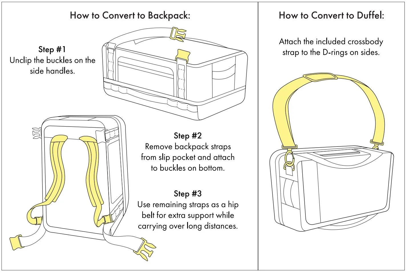 Allows the backpack duffel to slide over trolley bars for hands-free carrying.